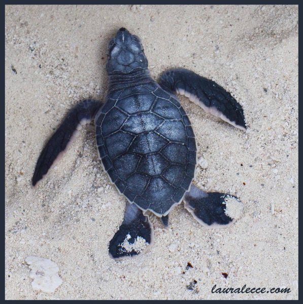 This photo not only marks one of the highlights I experienced on a recent trip to Mexico, but a highlight of my life. The beach we stayed on was incredibly beautiful with endless white sand and calm turquoise water. Just outside our room was an enclosed area with numerous little signs posts in the ground, much like a cemetery. Curiously I went to investigate, and to my delight I realized these signs marked mounds of recently laid turtle eggs. Each sign had NIDO written on it (meaning nest in Spanish) with the number of eggs buried (usually 100 or more), and the date they were laid. I was instantly appreciative of the care the resorts have put into this endeavor, when it would certainly have been easier to ignore that they have encroached on a turtle nesting beach. Each night the resort security was seen patrolling the beach, and staff would then relocate any newly laid eggs to these protected areas to stop them getting destroyed by beach goers. As I was reading each of the signs, I realized that literally thousands of baby sea turtles were incubating in the sand in front of me. I quickly Googled how long it takes for baby turtles to hatch and at what time of day, learning that it takes about 8-10 weeks and they hatch at night. As they were mostly laid in August, I knew my chances were slim, but a few had July dates, so I was still hopeful of a newborn turtle sighting. Each night after dark I checked for baby turtles, and was disappointed that they all remained buried. Then, one day at noon when I looked out the window, I glimpsed a tiny movement in the turtle enclosure and ran out to find two little blue babies scurrying around in the sand! Worried that the midday sun would quickly cook them, I sent my husband to notify the resort staff while I guarded my babies. The resort staff came running with their “turtle tub” and let us pick them up to put them in. They also tracked the little prints in the sand to identify which nest they were born from and started digging to uncover any more which had hatched, but not yet escaped the sand and found 5 more. I asked if they would take them to the water to release them, and they explained to me that if they did, the birds would quickly eat them, so they keep them safe until nightfall. That night as we were walking along the beach, each of the resorts came to the water with their babies in a tub. One of them contained hundreds of teeny, tiny turtles born that day. We were each handed two turtles to place gently on the sand and watch as they scurried into the ocean waves. I will admit that I cried as I did this, completely overwhelmed at the experience, and of knowing that I helped these little cuties safely reach the water. Simultaneously, my heart was also breaking with the realization that many will not make it far, and instead become prey to the monsters lurking in the dark waters. I was also in absolute awe of mother nature, knowing that one day the few girls that make it to maturity, possess in their tiny brains the GPS coordinates of this same beach, which they will revisit (in 20-50 years) to lay their very own eggs.
