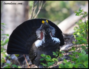 This is a gloriously proud male grouse who had decided I was infringing upon his territory. To let me know this he performed his intimidation dance – tail feathers sprawled, neck feathers on end to uncover that red wrinkly skin, and an angry frown with his bright yellow eyebrows. Little did he know, that instead of scaring me away, his dance was what got him noticed in the first place. After taking his photo, I let him think he won and scared me off with his territorial display. Such a gorgeous and unusual bird!