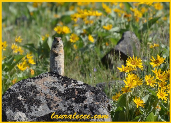 Any creature in a meadow of bright yellow flowers is adorable, but these cute and furry ground squirrels are also very entertaining. You may also know them as marmots, groundhogs, woodchucks or whistle pigs. The last name describes the shrill call they make to alert the colony of trespassers nearby (such as us humans). Which also means that as you walk through whistle pig territory (Yellowstone National Park), you have high-pitched music following you around everywhere you go.