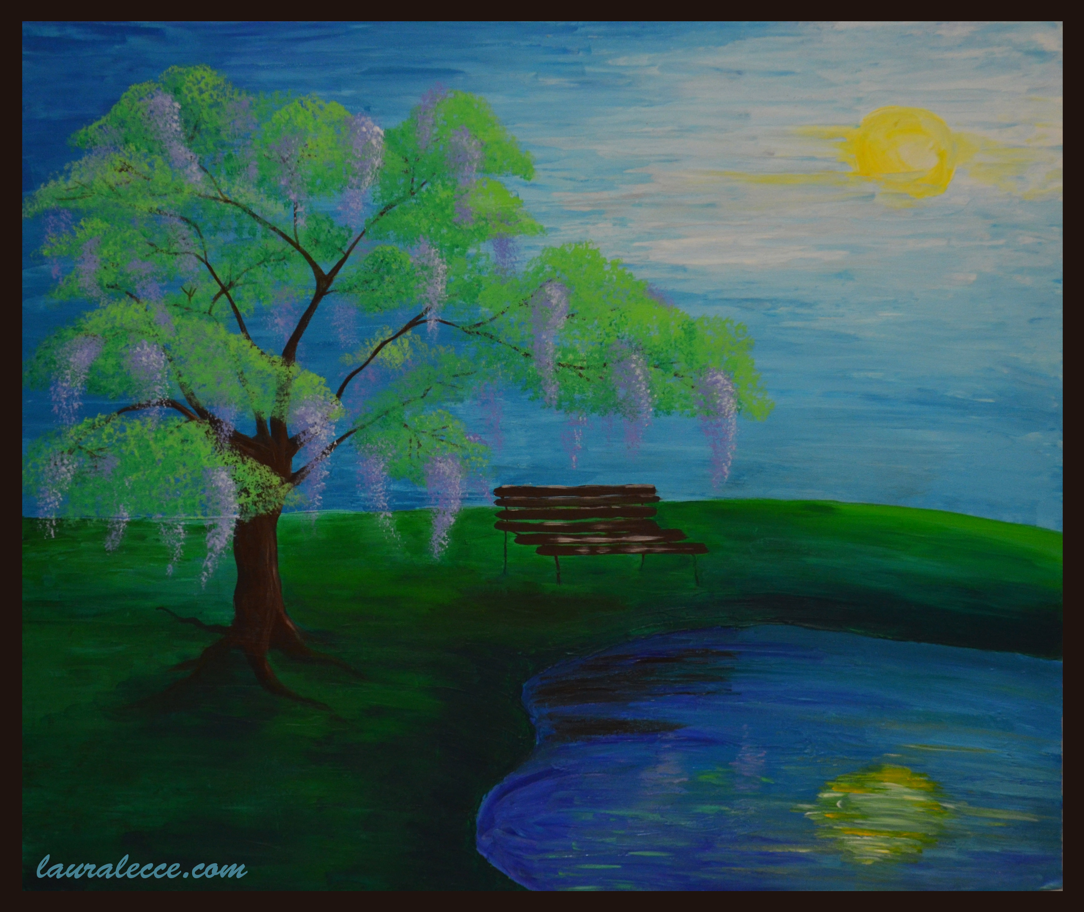 This painting gives me a sense of loneliness. Maybe its the empty park bench, the sun going down and the day coming to an end.
